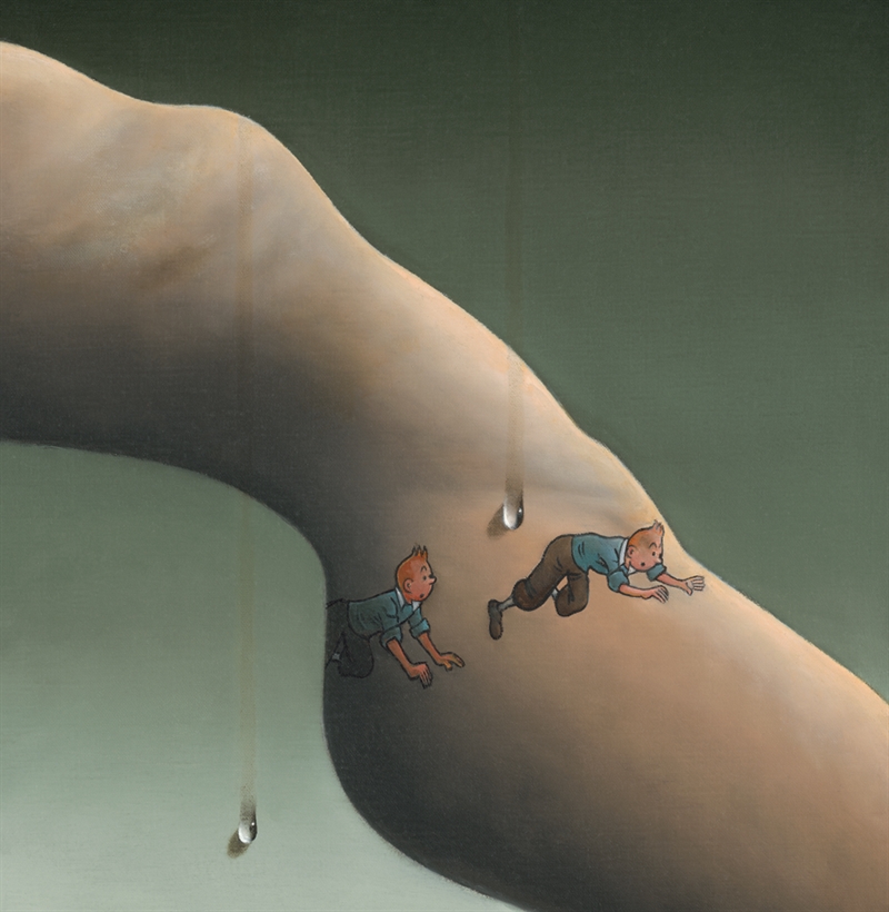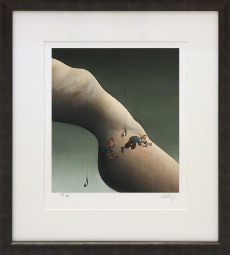 Fascinerende nyt motiv hvor Tintin optræder i et surrealistisk univers. I motivet kravler to versioner af Tintin hen over en kvindekrop, mens dråber falder dramatisk ned fra oven. Det simple farvevalg og de stærke kontraster mellem figurernes klare tegneseriestil og den drømmelignende baggrund skaber en intens og mystisk atmosfære.